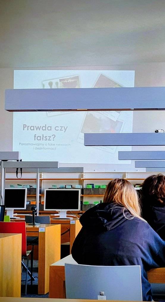 Zajęcia miały charakter praktyczny – uczniowie analizowali przykłady, poznali narzędzia do weryfikacji informacji i dyskutowali o roli krytycznego myślenia w świecie cyfrowym.