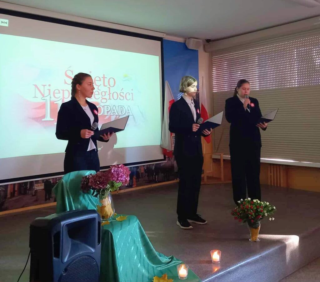 W piątek w naszej szkole odbył się uroczysty apel z okazji Święta Niepodległości, który był zwieńczeniem obchodów Tygodnia z Niepodległą. W czasie apelu uczniowie zaprezentowali program artystyczny przypominający najważniejsze wydarzenia z historii odzyskania wolności przez Polskę. Nie zabrakło pieśni patriotycznych, wierszy oraz refleksji nad znaczeniem wolności i odpowiedzialności za Ojczyznę.