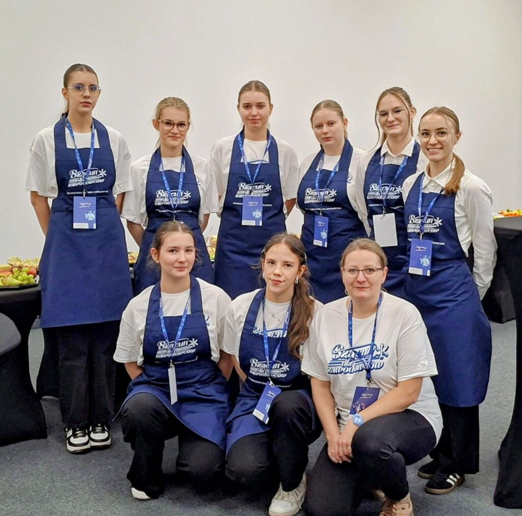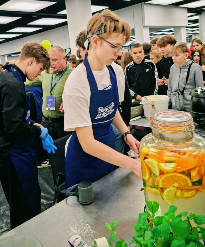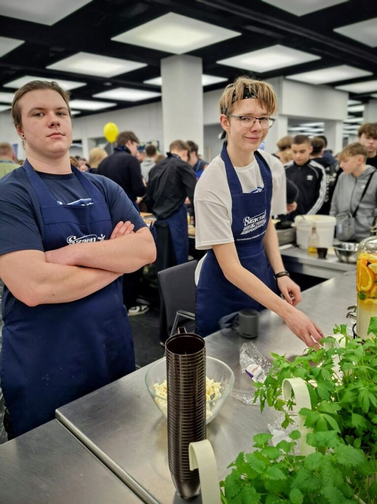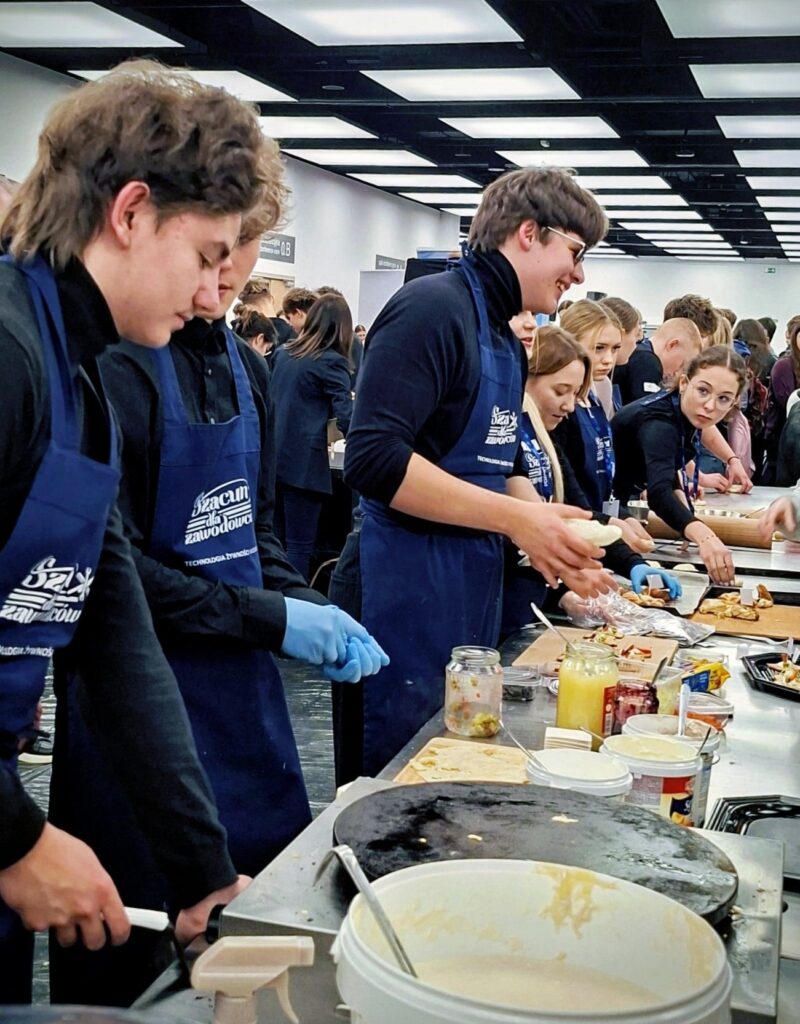 Oczywiście nie mogło tam zabraknąć profesjonalnej gastroekipy, a wśród niej naszych uczniów i uczennic. Z ogromnym zaangażowaniem odpowiadali na pytania młodszych kolegów i koleżanek oraz częstowali ich małym co nieco – bo choć głód wiedzy jest najważniejszy, to odrobina smakołyków jeszcze nikomu nie zaszkodziła.