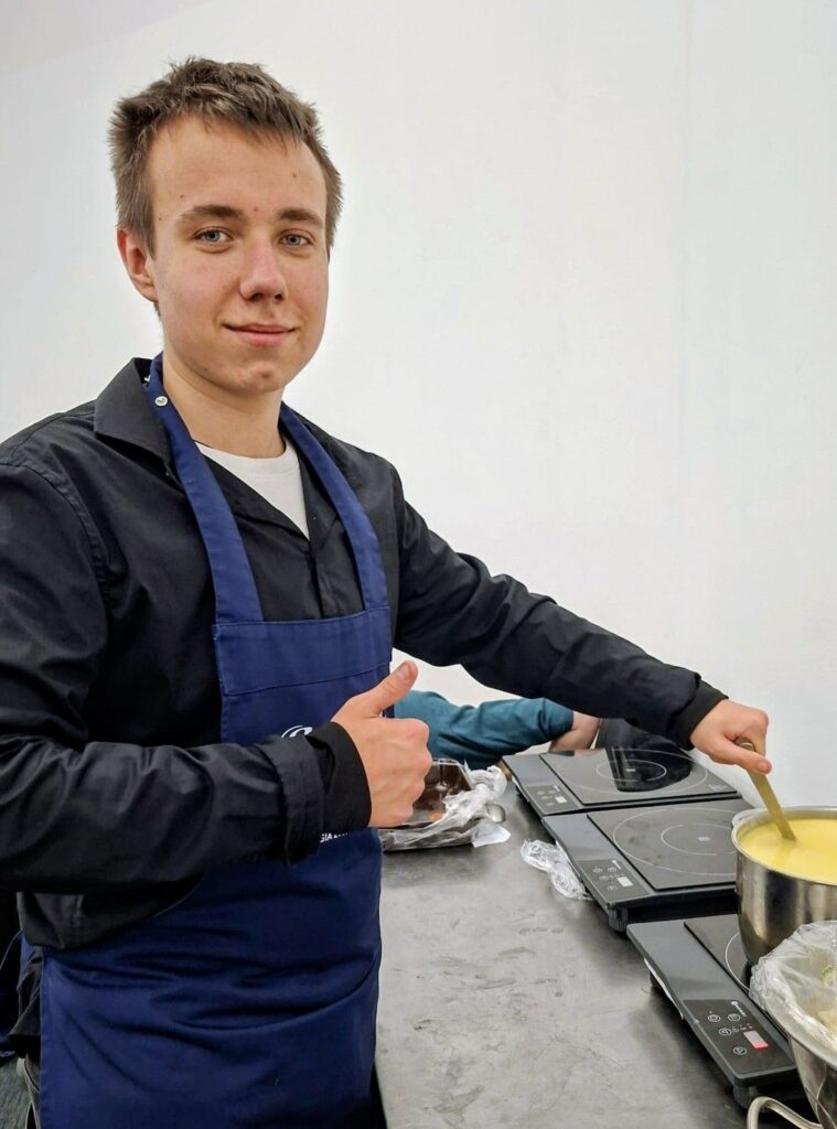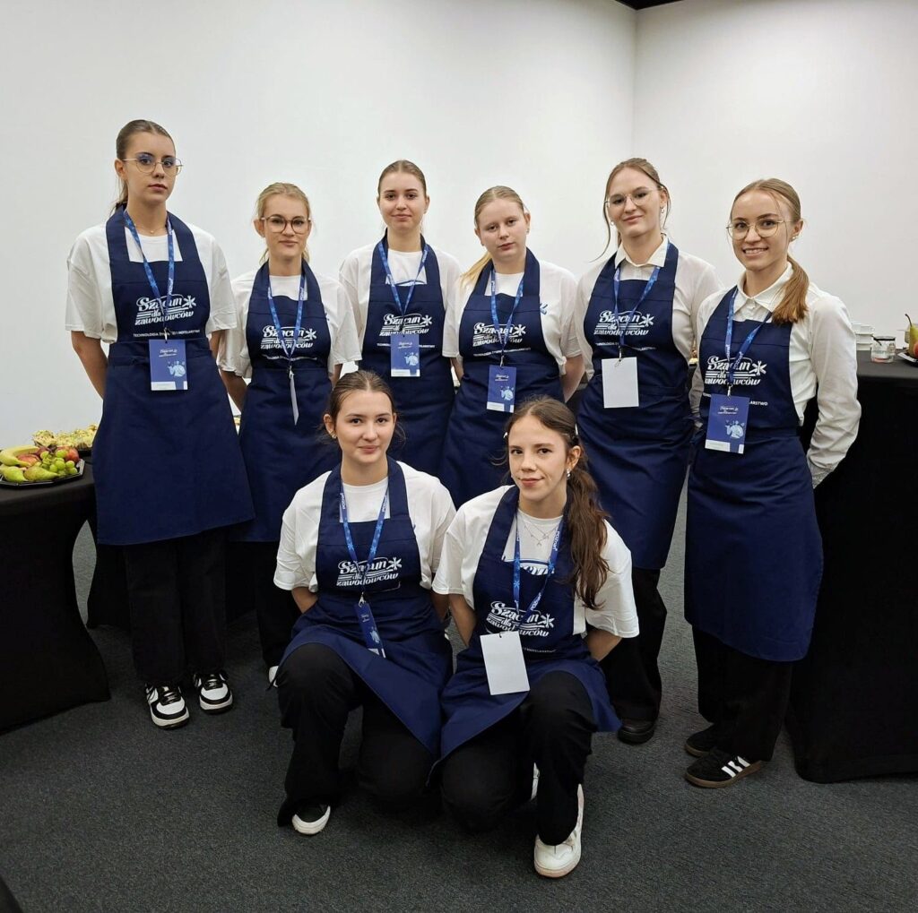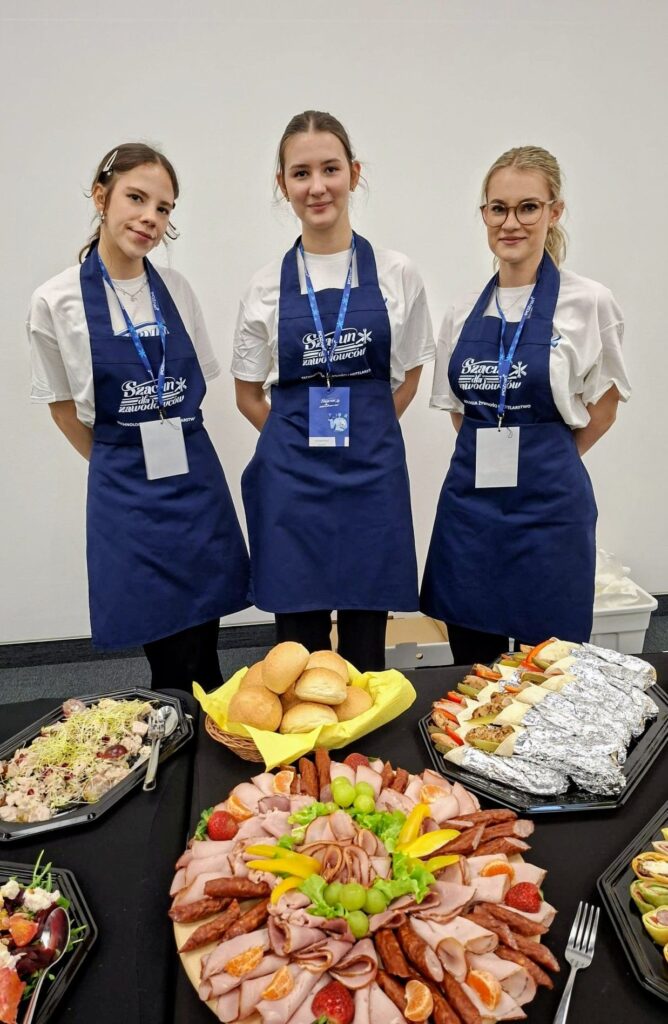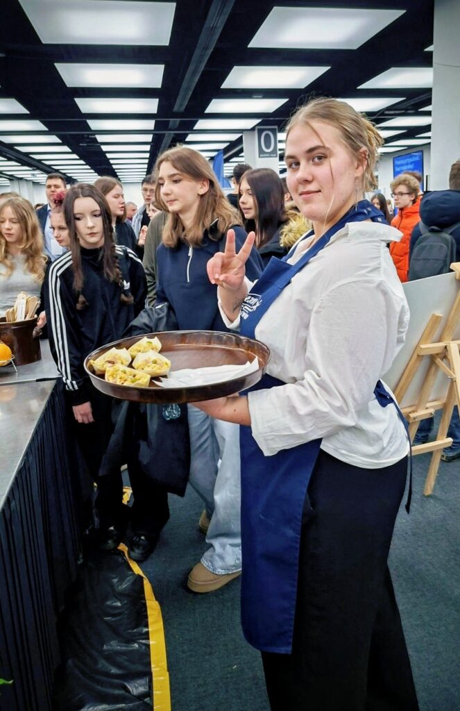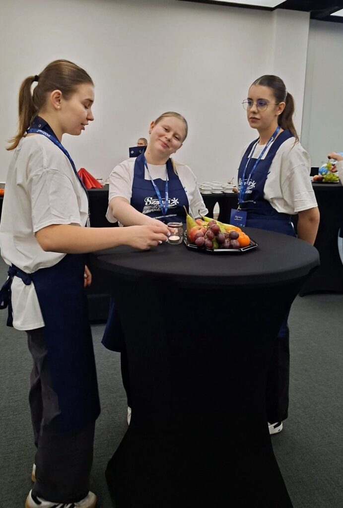 Oczywiście nie mogło tam zabraknąć profesjonalnej gastroekipy, a wśród niej naszych uczniów i uczennic. Z ogromnym zaangażowaniem odpowiadali na pytania młodszych kolegów i koleżanek oraz częstowali ich małym co nieco – bo choć głód wiedzy jest najważniejszy, to odrobina smakołyków jeszcze nikomu nie zaszkodziła.