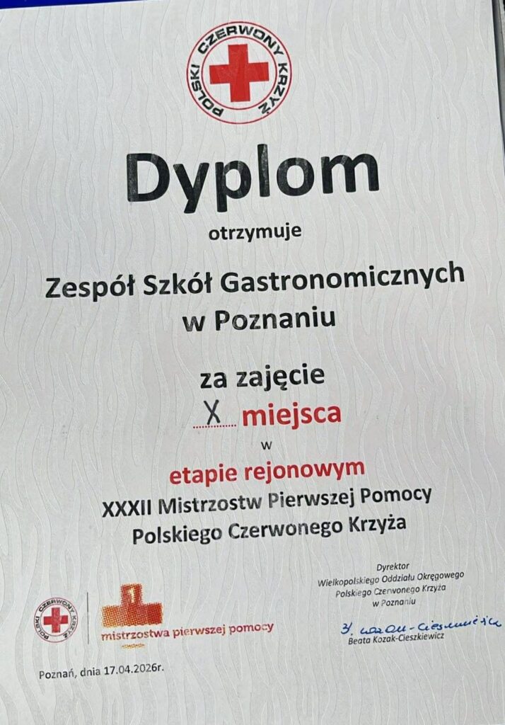 Z dumą informujemy, że reprezentacja Zespołu Szkół Gastronomicznych w Poznaniu wzięła udział w etapie rejonowym XXXII Mistrzostw Pierwszej Pomocy Polskiego Czerwonego Krzyża. Nasi uczniowie wykazali się ogromnym zaangażowaniem, wiedzą oraz umiejętnościami praktycznymi, zdobywając X miejsce w rywalizacji.
