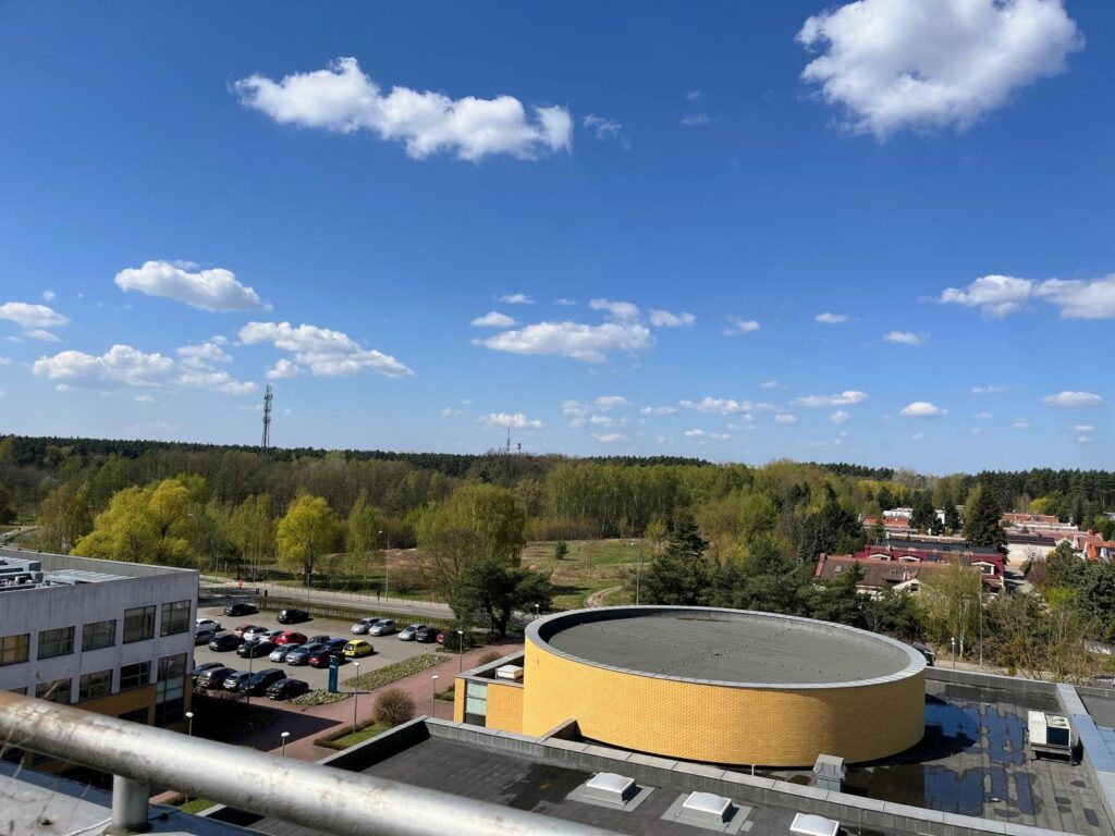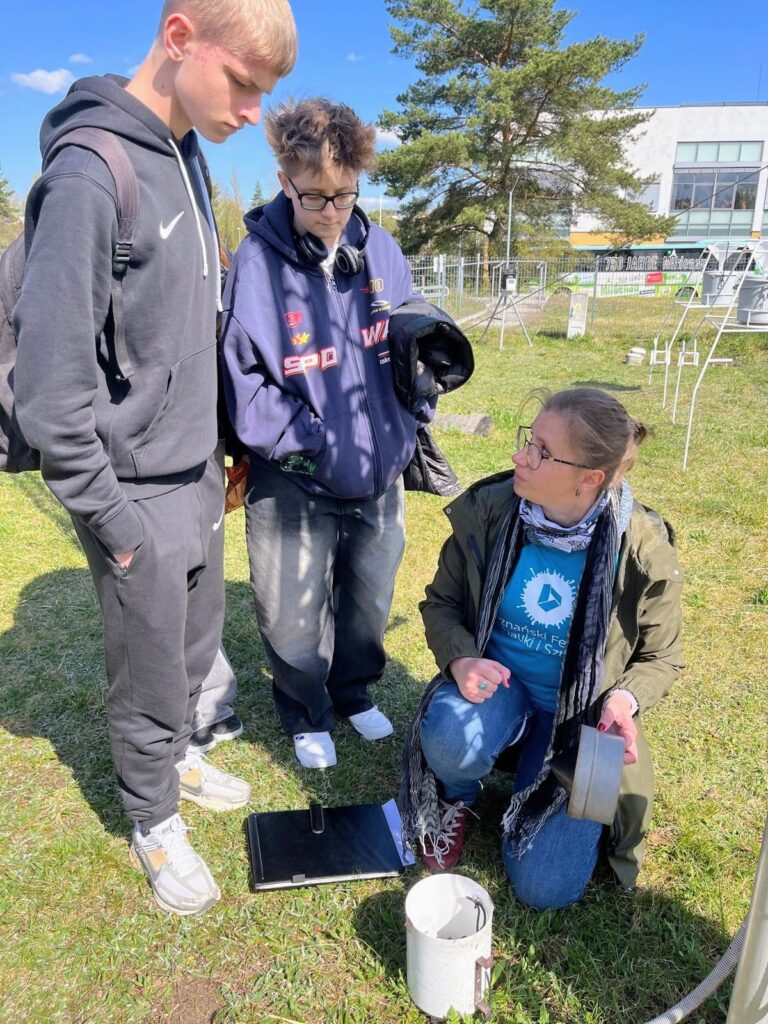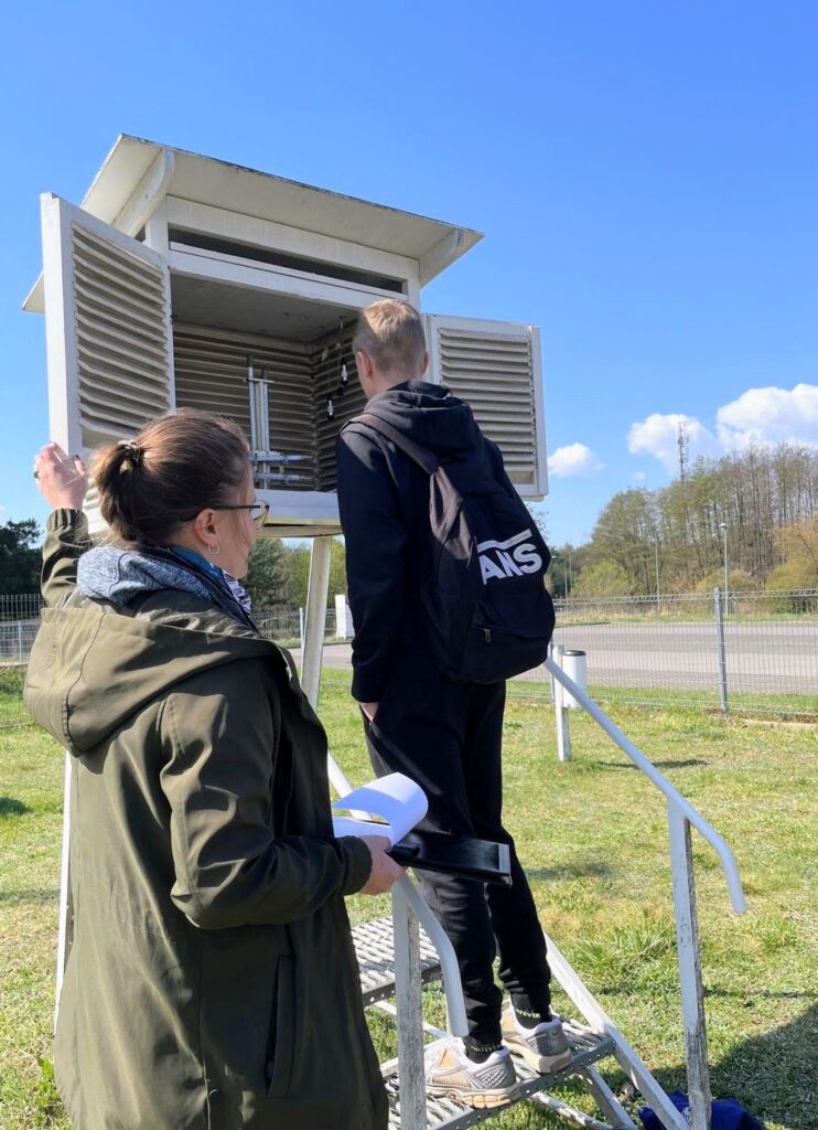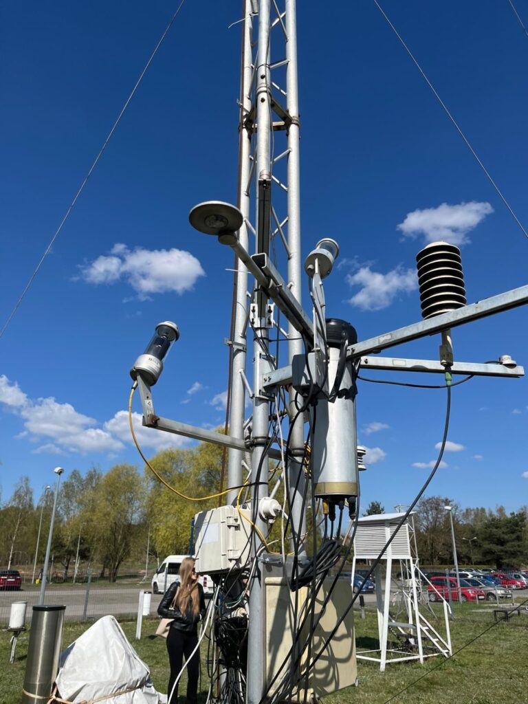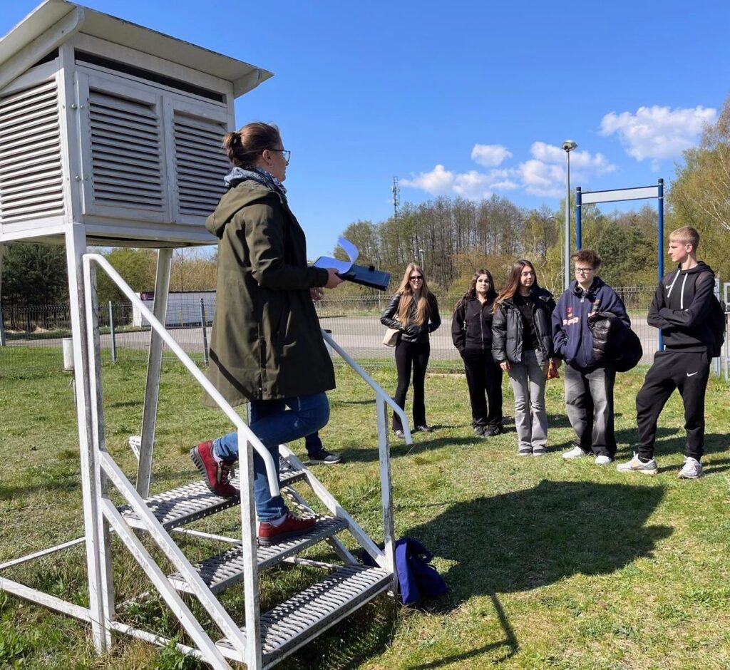 Po spotkaniu science fiction przeszliśmy na twardy grunt ogródka meteorologicznego. Tutaj mieliśmy możliwość zapoznania się z metodyką pomiarów składników pogody. Oglądaliśmy wszystkie urządzenia pomiarowe, wykorzystywane w badaniach mających na celu monitorowanie klimatu naszego miasta. W poznaniu jest 9 takich niewielkich stacji meteorologicznych, współpracujących ze sobą i pokazujących jak w różnych miejscach Poznania zmieniają się warunki pogodowe i jak zmienia się klimat. Na zakończenie tego etapu naszej przygody weszliśmy na dach uczelni i mogliśmy podziwiać piękny widok okolic Moraska.