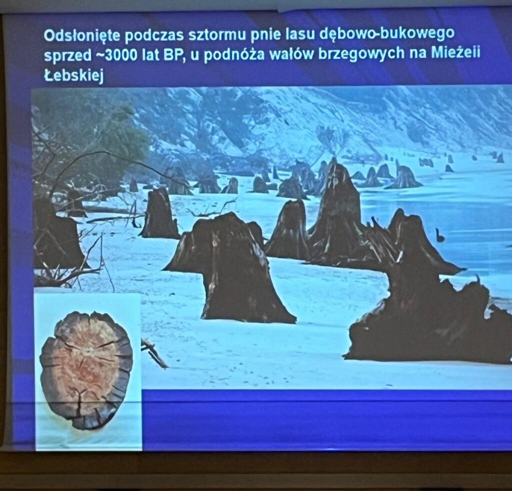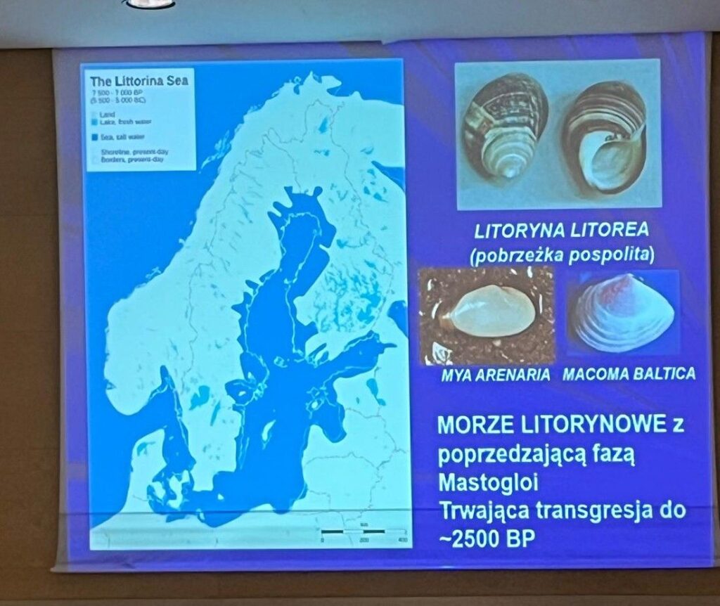 Początek naszej naukowej przygody to niezwykle ciekawy wykład pana profesora Stankowskiego o historii geologicznej Morza Bałtyckiego. Nareszcie wiemy dokładnie skąd pochodzi bursztyn w naszym morzu … spływał jako żywica z lasów porastających północą Europę wielką rzeką Eridan, która kończyła swój bieg ogromną deltą na obszarze dzisiejszej północnej Polski. Działo się to dawno … dawno …. dawno temu, jakieś 40 milionów. Wiemy też jak zmieniało się oblicze Bałtyku wraz ze zmianami klimatycznymi po ustąpieniu zlodowacenia.