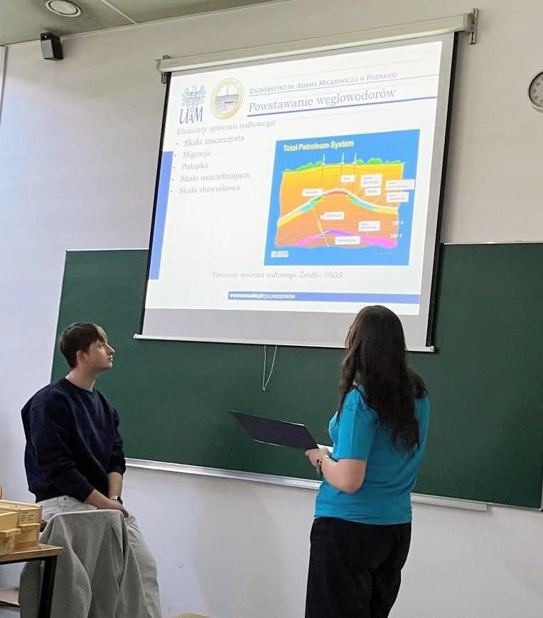 Z najwyższego piętra uczelni przeszliśmy na spotkanie z geologami, którzy opowiadali o powstawaniu ropy naftowej i gazu ziemnego. Mogliśmy dotknąć odwiertów skał, w których fitoplankton zmienił się w ropę. Wiemy też jak pachnie taka „surowa” gęsta, brunatna ciecz, która zamieniana jest w paliwo. Rozwiązanie krzyżówki wyłoniło zwycięzców, którzy wyszli z tych zajęć z trofeum w postaci minerału kwarcu.
